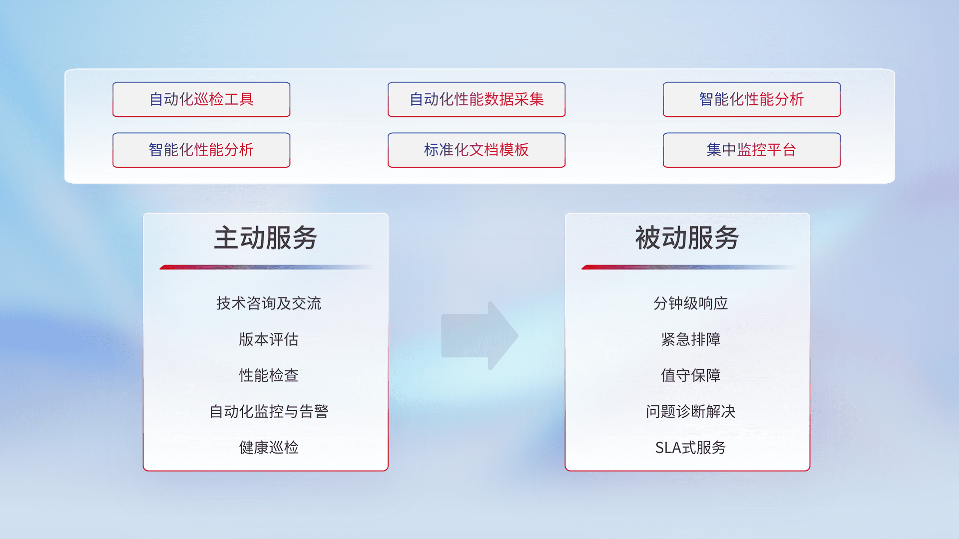 智能化工具和标准化文档,,,,保障服务质量,,提供主动服务(包含技术咨询、、、、版本评估、、、、性能检查、、、自动化监控与告警、、、、健康巡检)和被动服务包含(分钟级响应、、、紧急排障、、、值守保障、、、、问题诊断解决、、、、SLA服务)。。