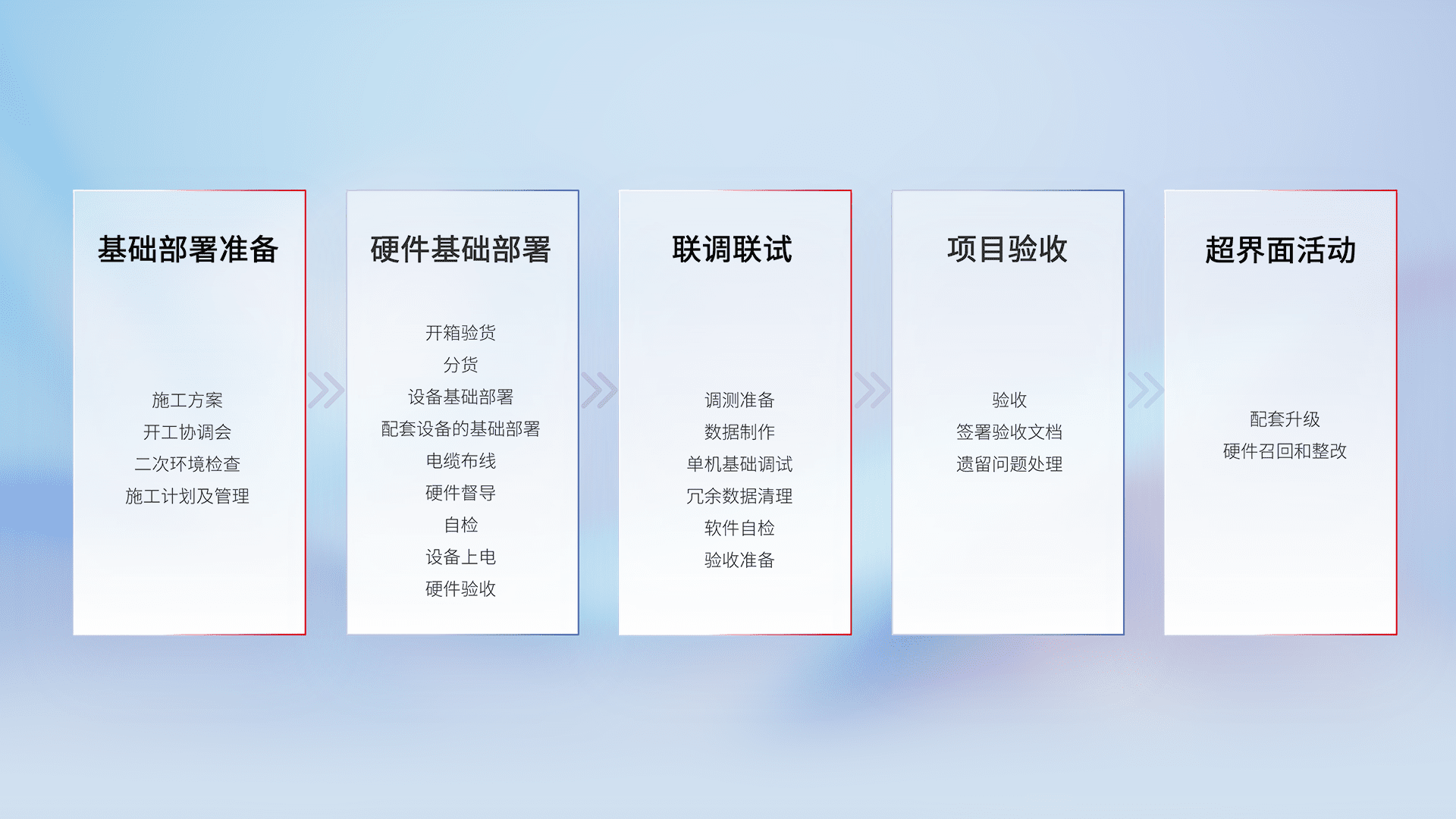 从基础部署准备、、、、硬件基础部署、、、、联调联试、、、、项目验收、、、越界面活动的全过程可追溯,,保证施工质量和进度。。